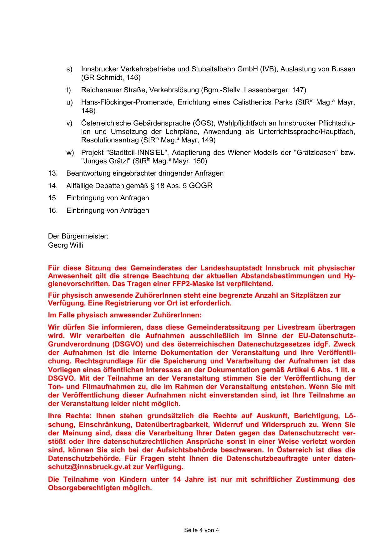 Für diese Sitzung des Gemeinderates der Landeshauptstadt Innsbruck mit physischer