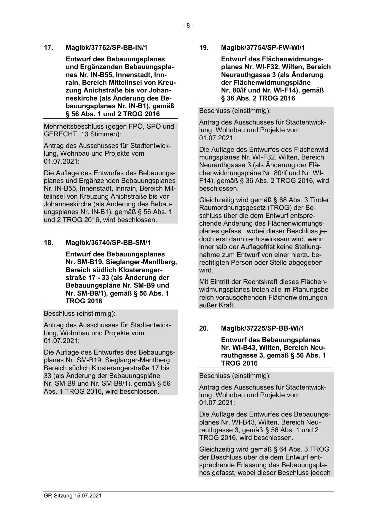 Raumordnungsgesetz (TROG) der Beschluss über die dem Entwurf entsprechende Änderung des Flächenwidmungsplanes gefasst, wobei dieser Beschluss jedoch erst dann rechtswirksam wird, wenn