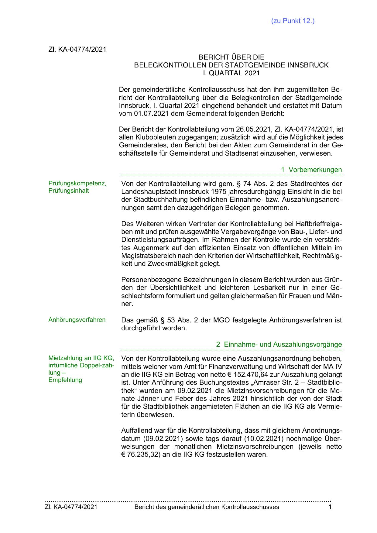 BELEGKONTROLLEN DER STADTGEMEINDE INNSBRUCK