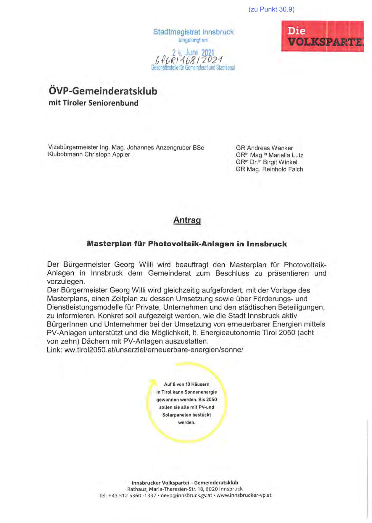 Der Bürgermeister Georg Willi wird beauftragt den Masterplan für PhotovoltaikAnlagen in Innsbruck dem Gemeinderat zum Beschluss zu präsentieren und