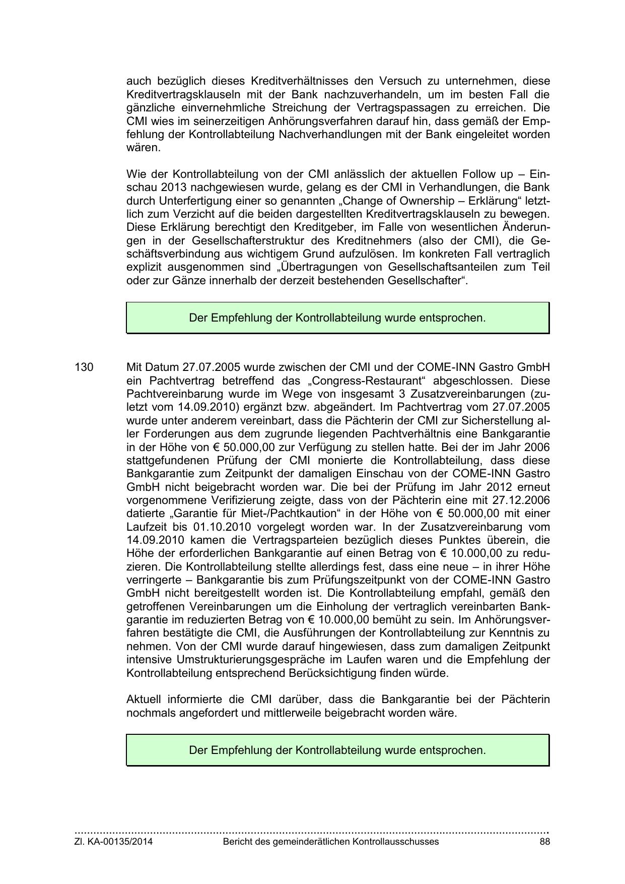 getroffenen Vereinbarungen um die Einholung der vertraglich vereinbarten Bankgarantie im reduzierten Betrag von € 10.000,00 bemüht zu sein. Im Anhörungsverfahren bestätigte die CMI, die Ausführungen der Kontrollabteilung zur Kenntnis zu