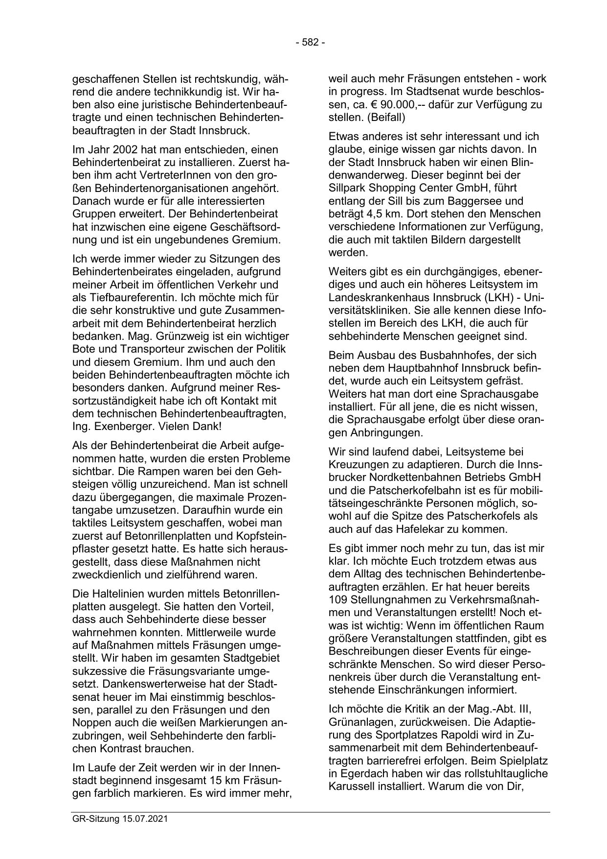geschaffenen Stellen ist rechtskundig, während die andere technikkundig ist. Wir haben also eine juristische Behindertenbeauftragte und einen technischen Behindertenbeauftragten in der Stadt Innsbruck.