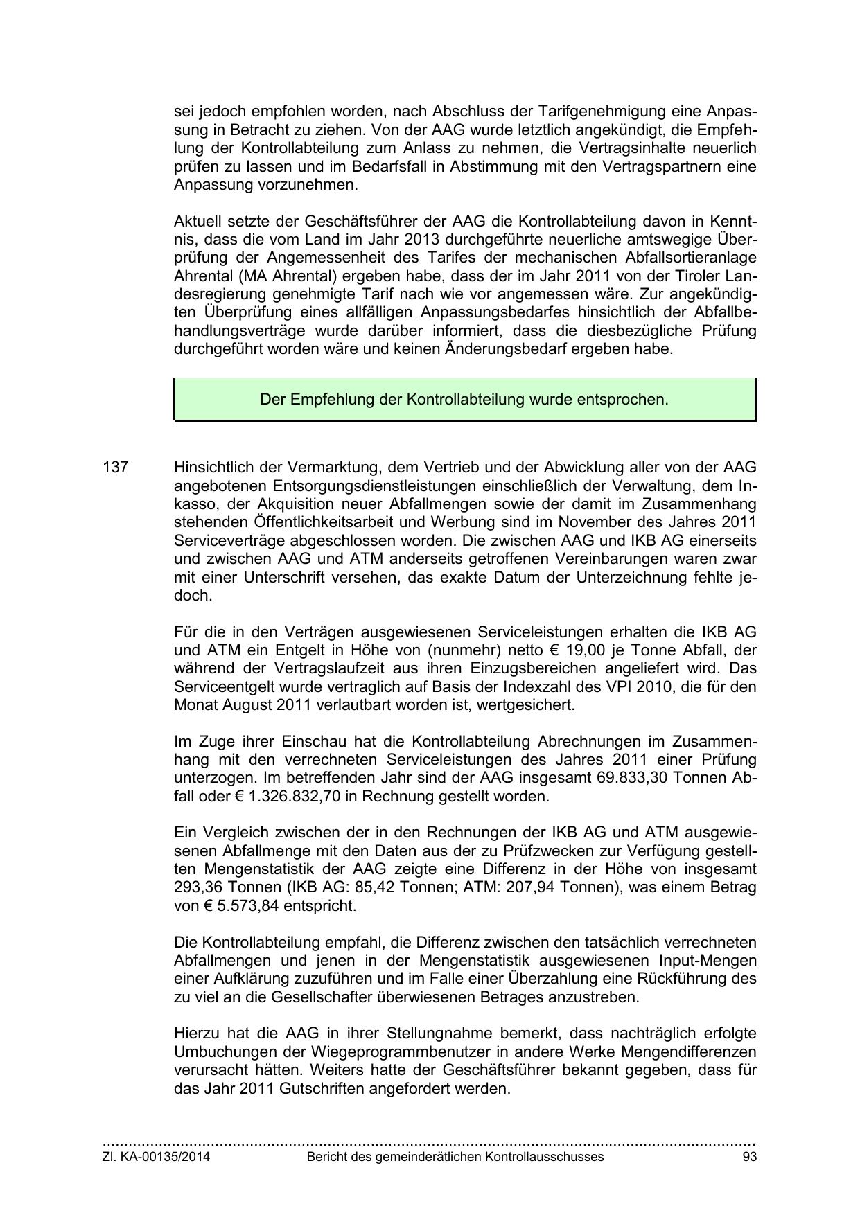 Ahrental (MA Ahrental) ergeben habe, dass der im Jahr 2011 von der Tiroler Landesregierung genehmigte Tarif nach wie vor angemessen wäre. Zur angekündigten Überprüfung eines allfälligen Anpassungsbedarfes hinsichtlich der Abfallbehandlungsverträge wurde darüber informiert, dass die diesbezügliche Prüfung