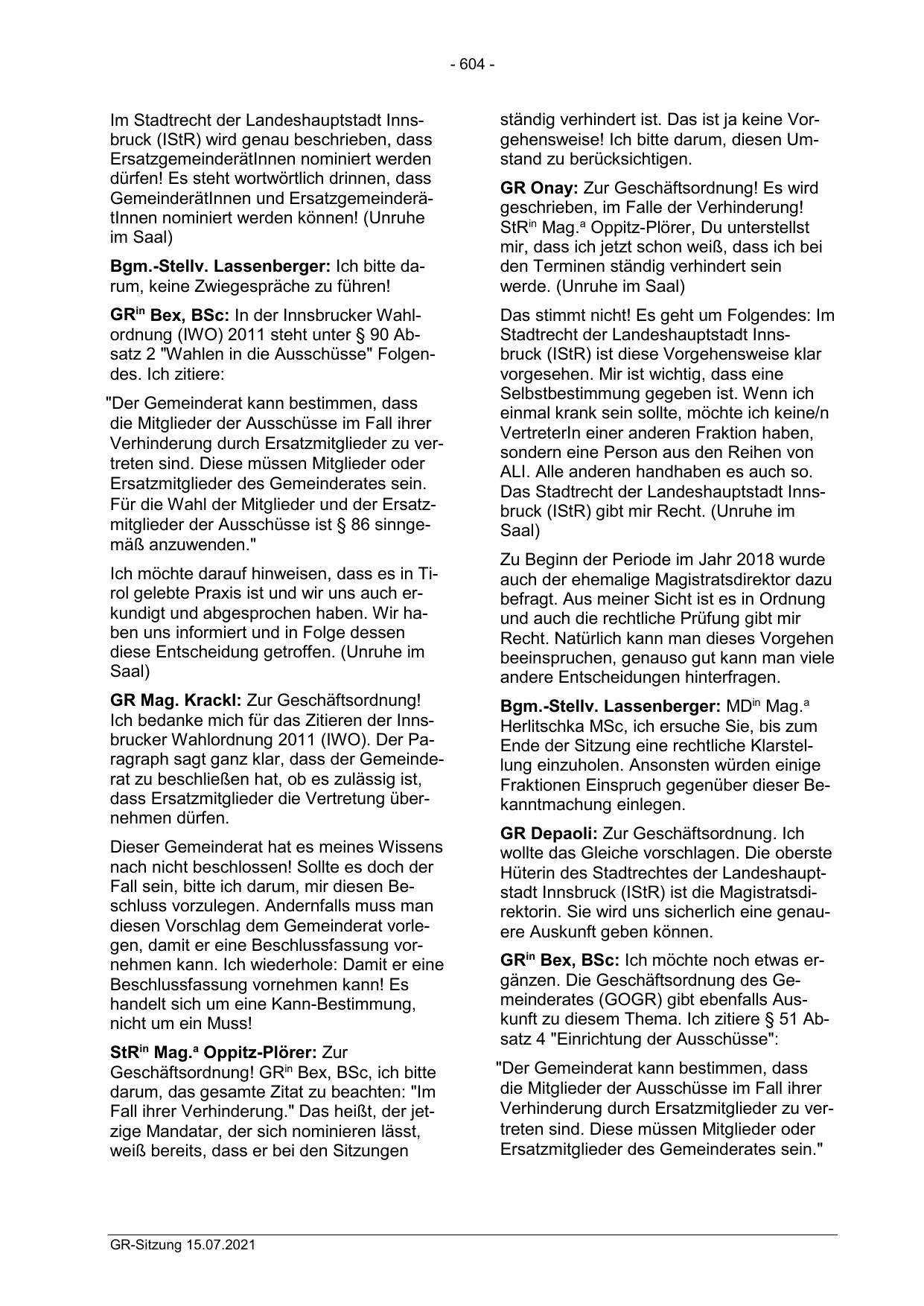 GRin Bex, BSc: In der Innsbrucker Wahlordnung (IWO) 2011 steht unter § 90 Absatz 2 "Wahlen in die Ausschüsse" Folgendes. Ich zitiere: