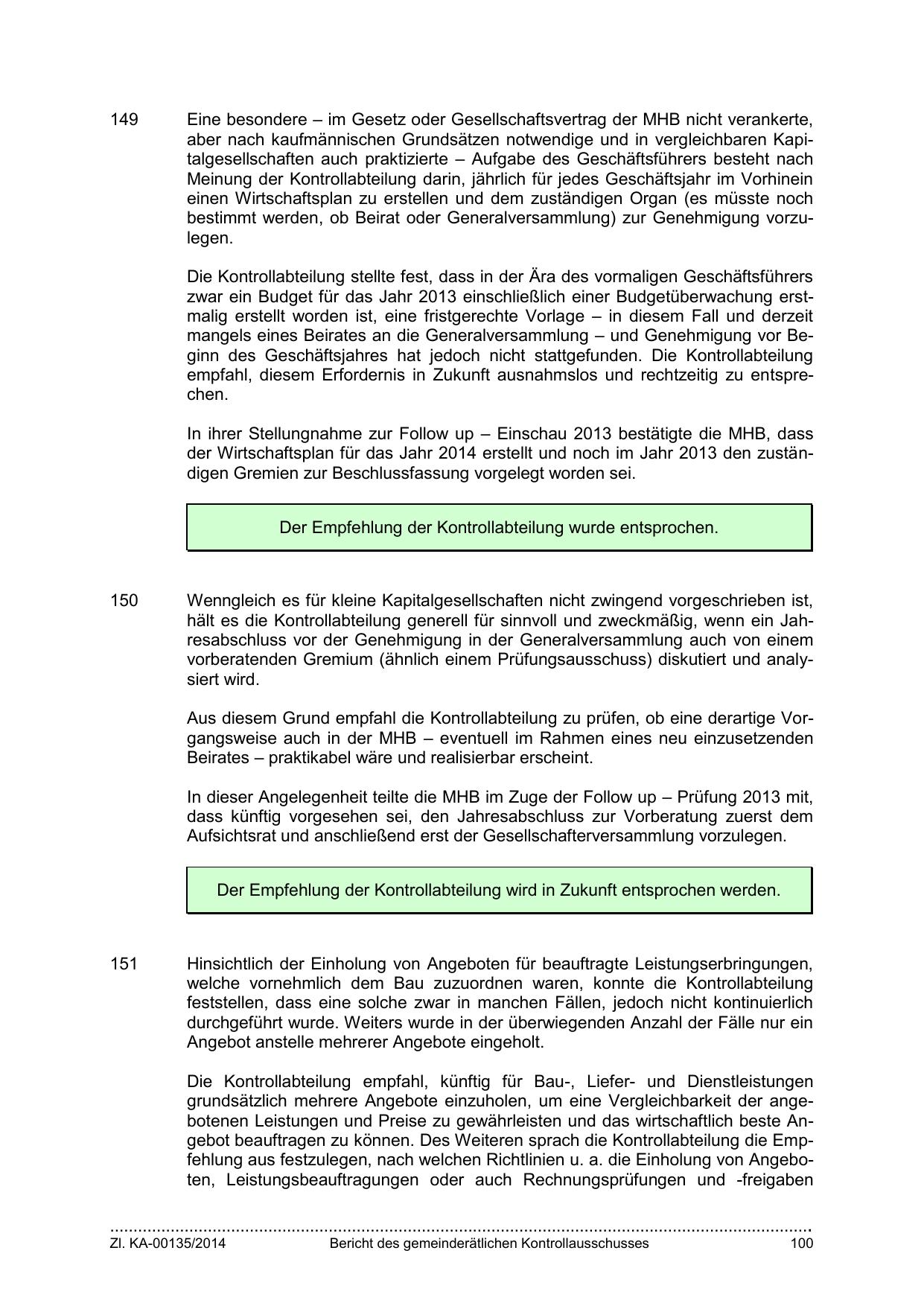 In dieser Angelegenheit teilte die MHB im Zuge der Follow up – Prüfung 2013 mit,