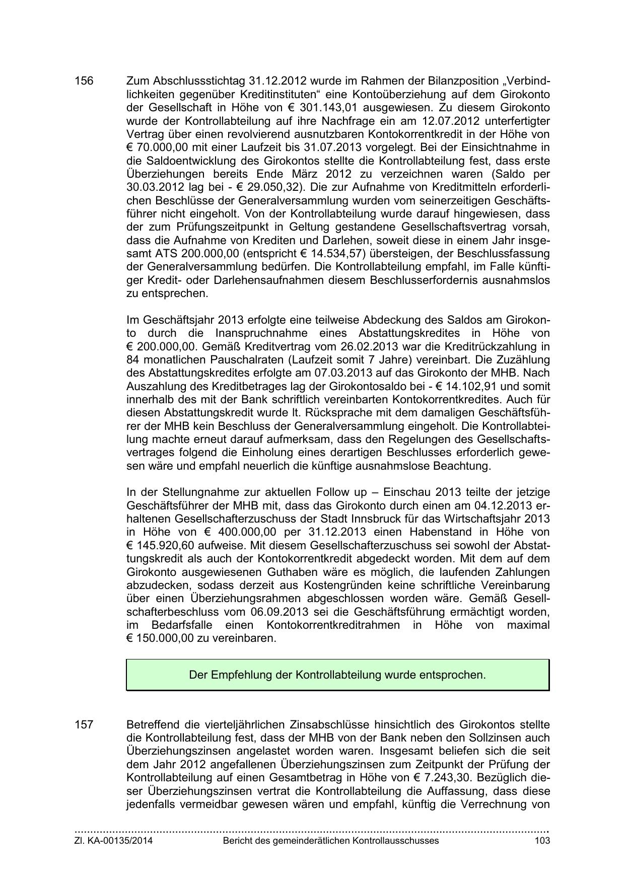 diesen Abstattungskredit wurde lt. Rücksprache mit dem damaligen Geschäftsführer der MHB kein Beschluss der Generalversammlung eingeholt. Die Kontrollabteilung machte erneut darauf aufmerksam, dass den Regelungen des Gesellschaftsvertrages folgend die Einholung eines derartigen Beschlusses erforderlich gewesen wäre und empfahl neuerlich die künftige ausnahmslose Beachtung.