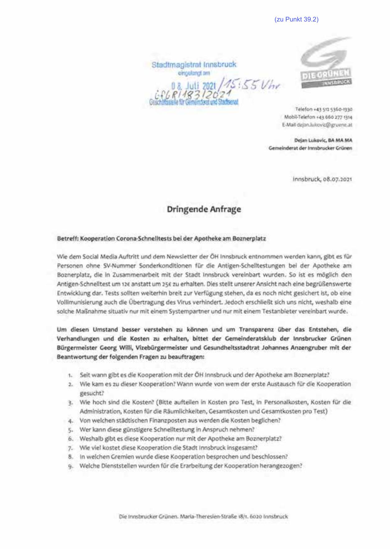 Verhandlungen und die Kosten zu erhalten, bittet der Gemeinderatsklub der lnnsbrucker Grünen