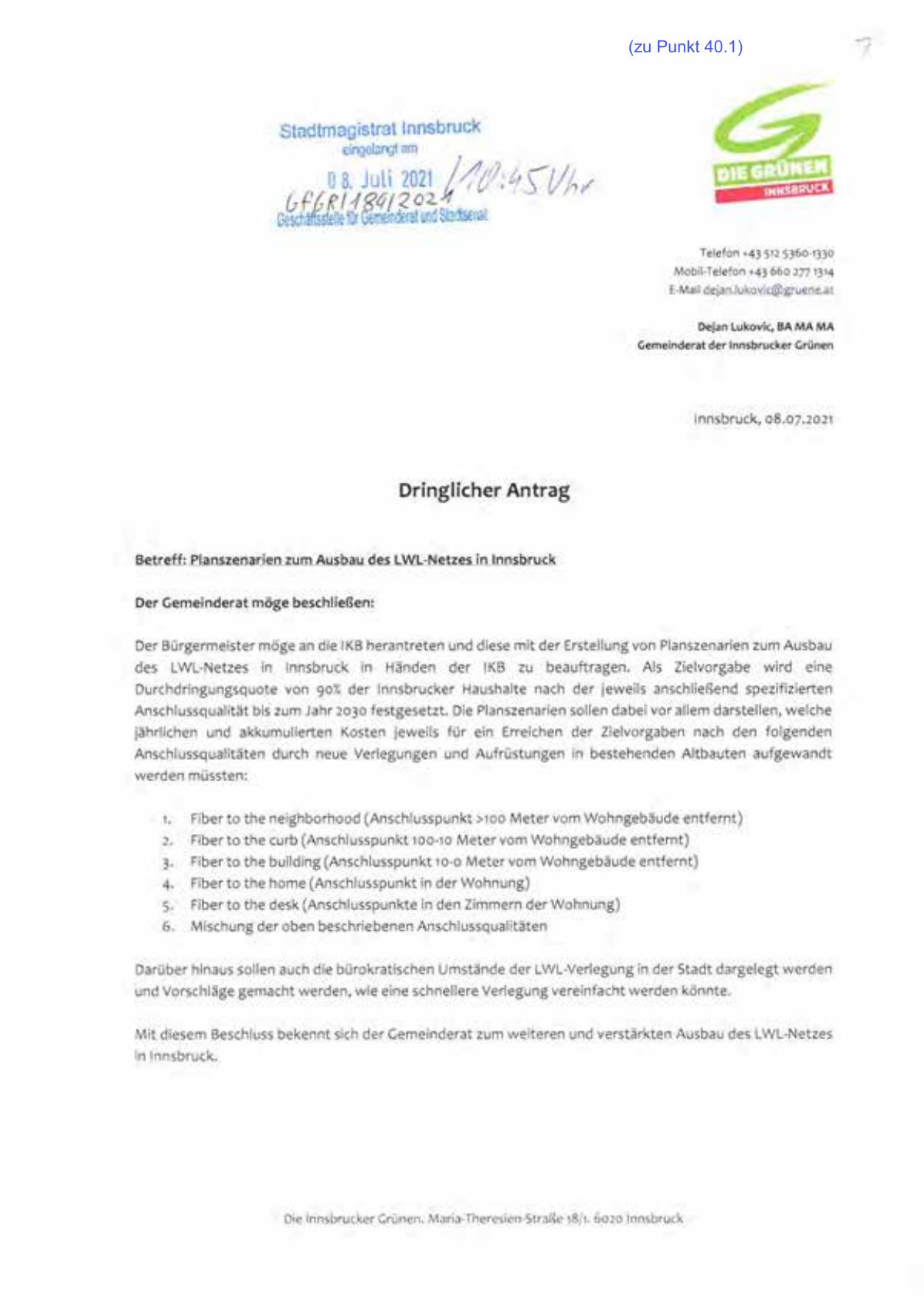 Betreff: Planszenarien zum Ausbau des LWL-Netzes in Innsbruck