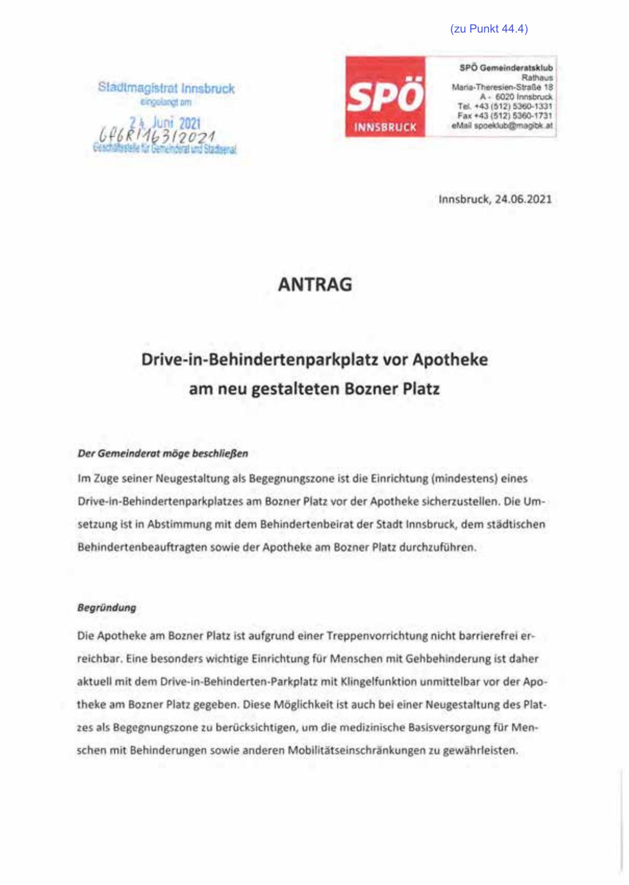 Drive-in-Behindertenparkplatzes am Bozner Platz vor der Apotheke sicherzustellen. Die Umsetzung ist in Abstimmung mit dem Behindertenbeirat der Stadt Innsbruck, dem städtischen