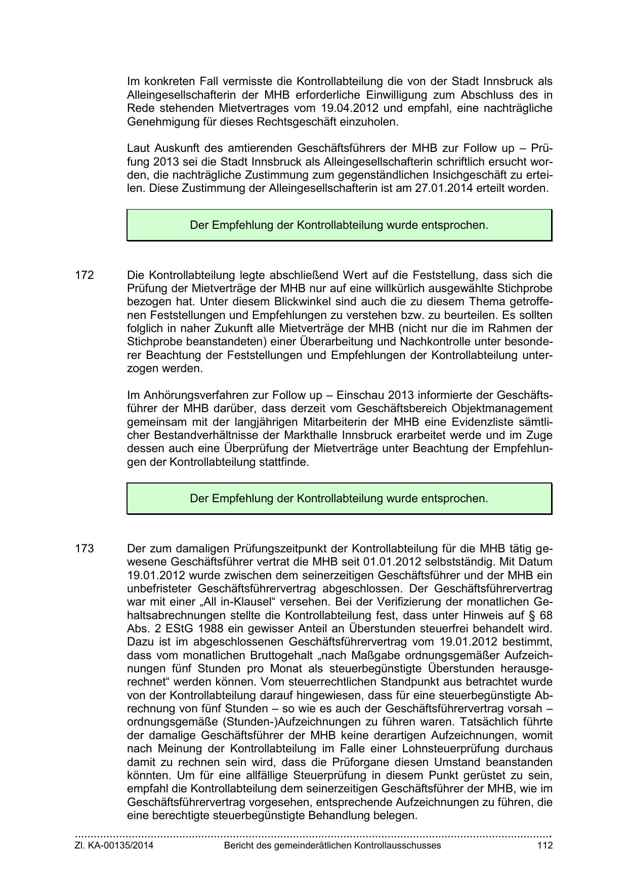 Laut Auskunft des amtierenden Geschäftsführers der MHB zur Follow up – Prüfung 2013 sei die Stadt Innsbruck als Alleingesellschafterin schriftlich ersucht worden, die nachträgliche Zustimmung zum gegenständlichen Insichgeschäft zu erteilen. Diese Zustimmung der Alleingesellschafterin ist am 27.01.2014 erteilt worden.