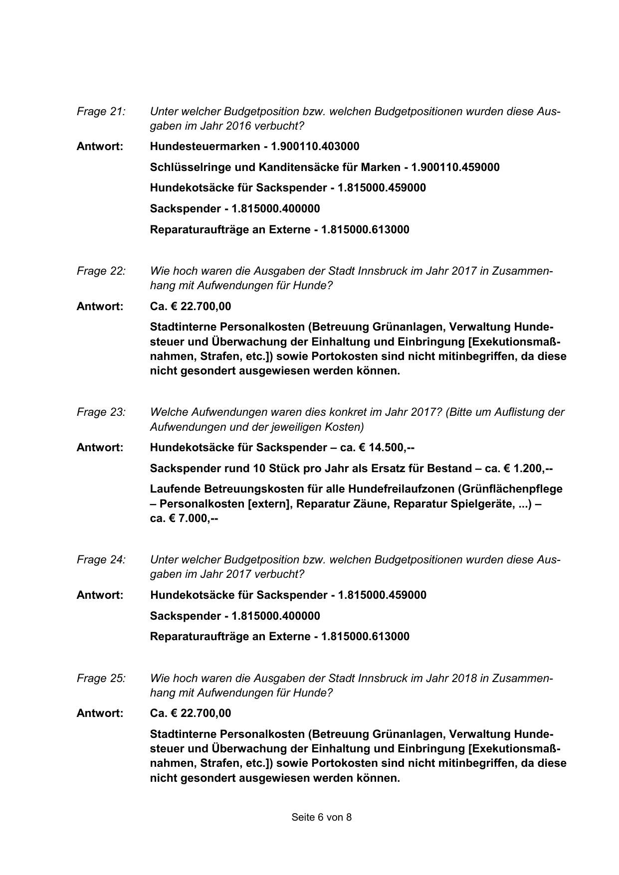 Stadtinterne Personalkosten (Betreuung Grünanlagen, Verwaltung Hundesteuer und Überwachung der Einhaltung und Einbringung [Exekutionsmaßnahmen, Strafen, etc.]) sowie Portokosten sind nicht mitinbegriffen, da diese