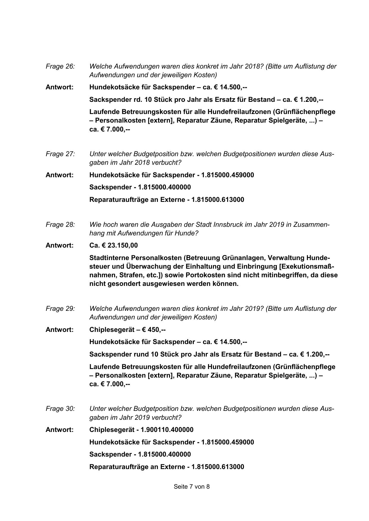 Chiplesegerät – € 450,-Hundekotsäcke für Sackspender – ca. € 14.500,-Sackspender rund 10 Stück pro Jahr als Ersatz für Bestand – ca. € 1.200,-Laufende Betreuungskosten für alle Hundefreilaufzonen (Grünflächenpflege