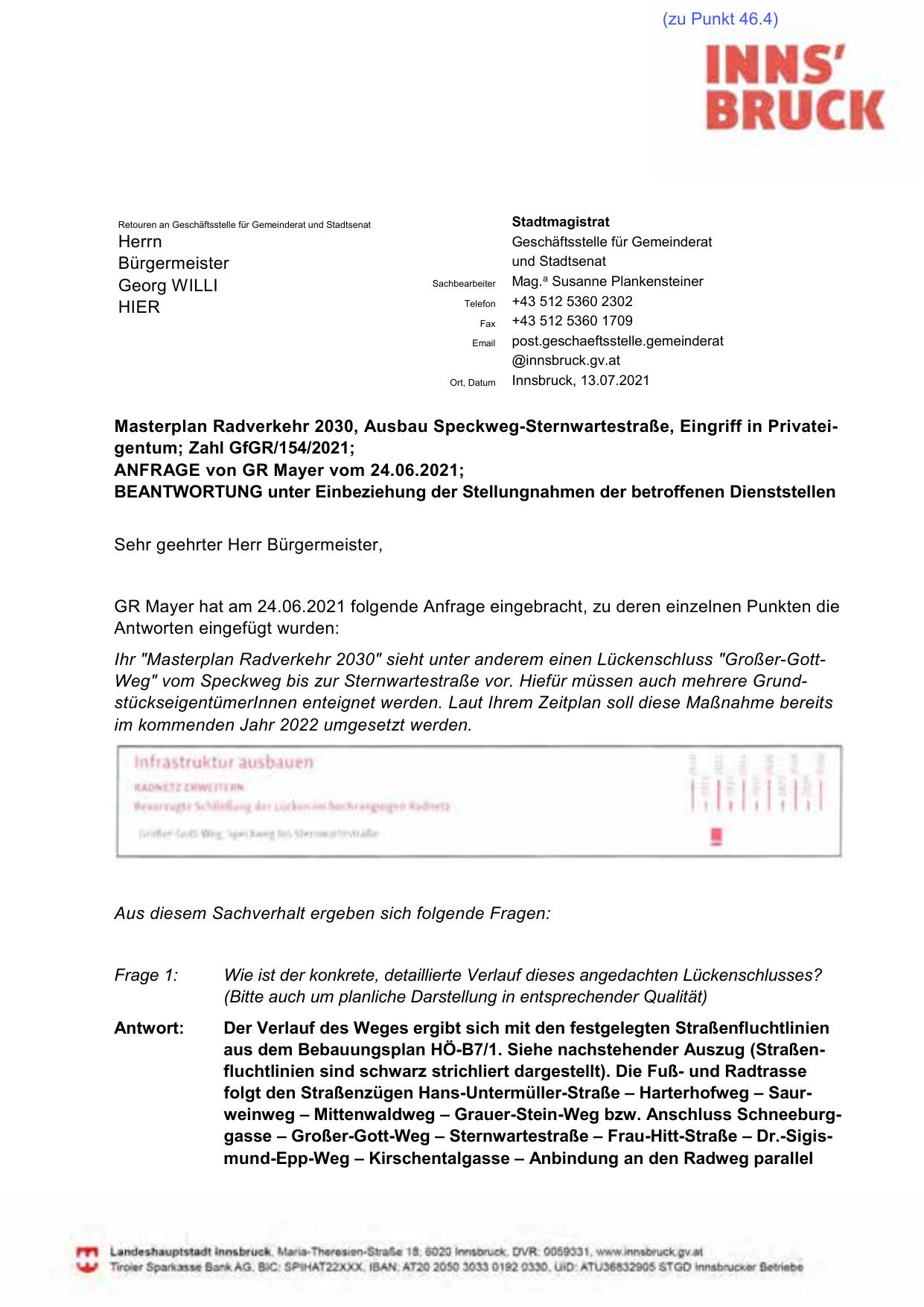GR Mayer hat am 24.06.2021 folgende Anfrage eingebracht, zu deren einzelnen Punkten die