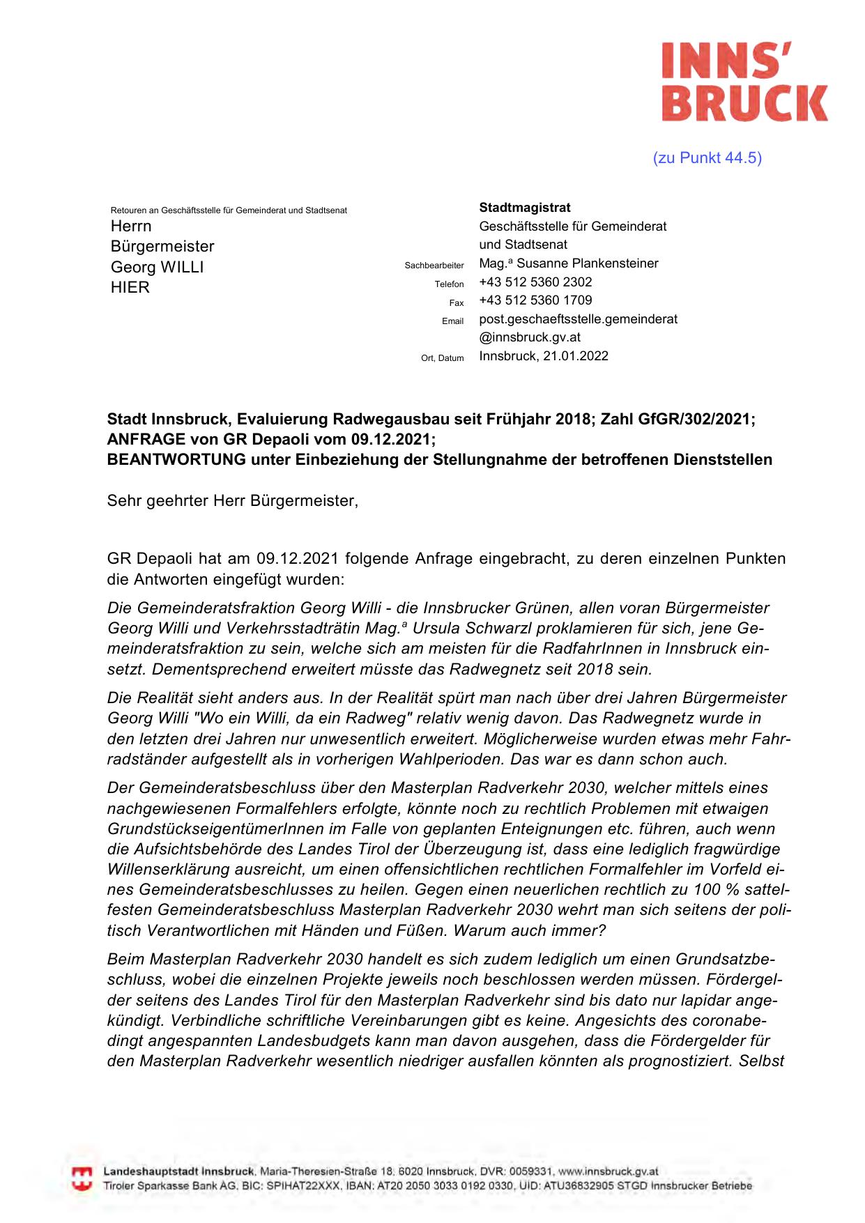 GR Depaoli hat am 09.12.2021 folgende Anfrage eingebracht, zu deren einzelnen Punkten