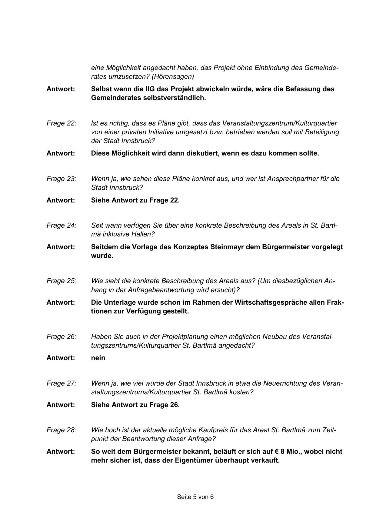 Wenn ja, wie viel würde der Stadt Innsbruck in etwa die Neuerrichtung des Veranstaltungszentrums/Kulturquartier St. Bartlmä kosten?