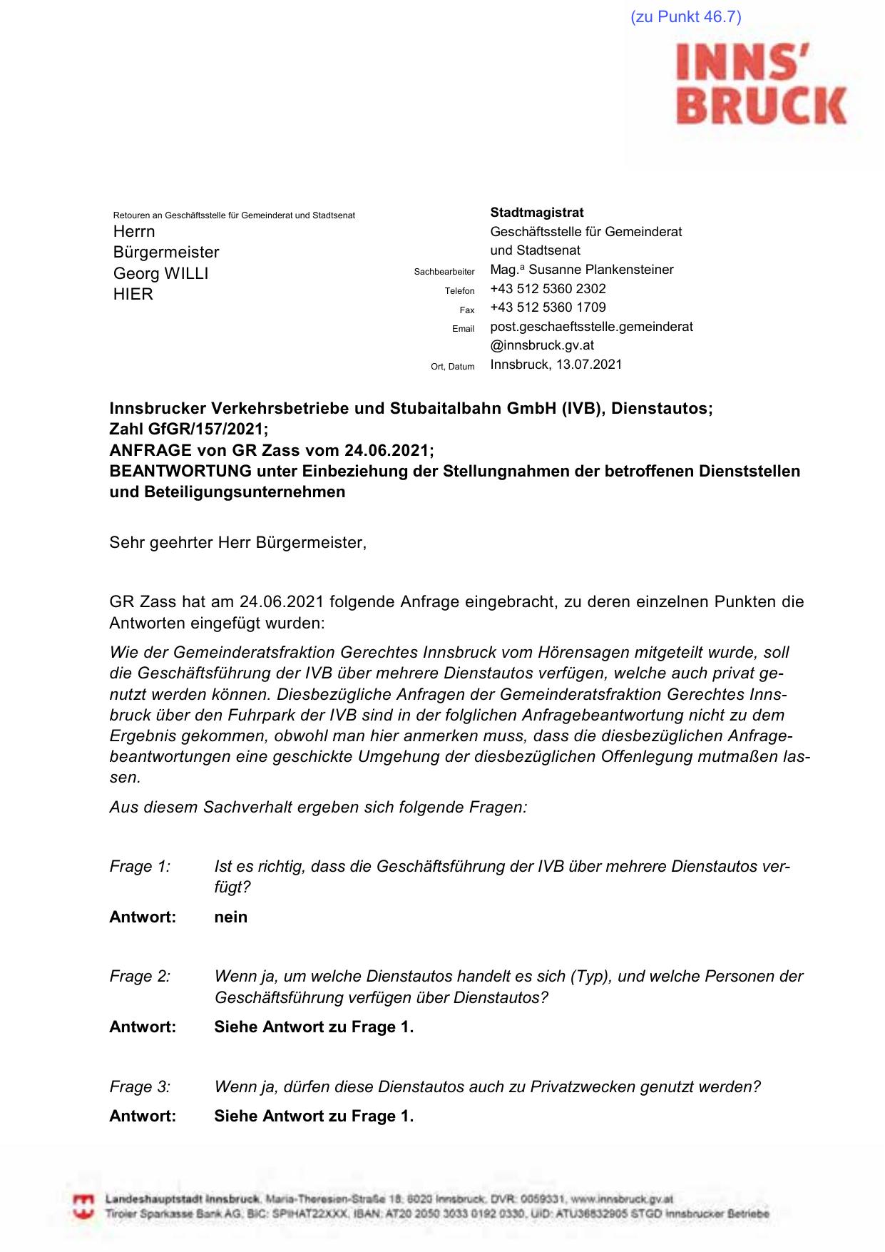 die Geschäftsführung der IVB über mehrere Dienstautos verfügen, welche auch privat genutzt werden können. Diesbezügliche Anfragen der Gemeinderatsfraktion Gerechtes Innsbruck über den Fuhrpark der IVB sind in der folglichen Anfragebeantwortung nicht zu dem