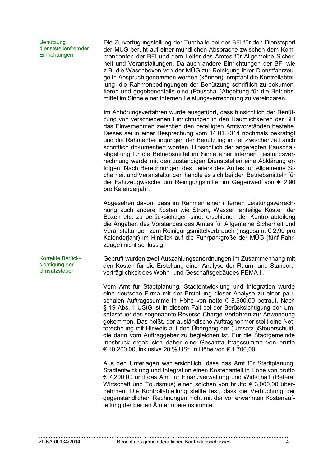 z.B. die Waschboxen von der MÜG zur Reinigung ihrer Dienstfahrzeuge in Anspruch genommen werden (können), empfahl die Kontrollabteilung, die Rahmenbedingungen der Benützung schriftlich zu dokumentieren und gegebenenfalls eine (Pauschal-)Abgeltung für die Betriebsmittel im Sinne einer internen Leistungsverrechnung zu vereinbaren.