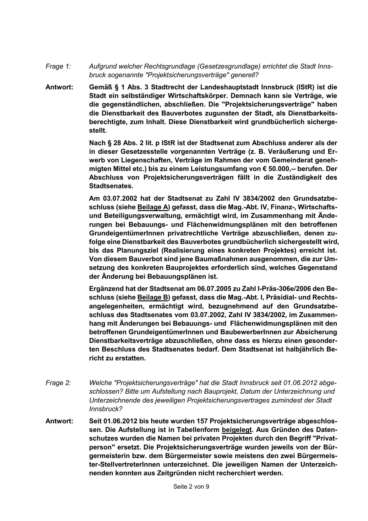 Seit 01.06.2012 bis heute wurden 157 Projektsicherungsverträge abgeschlossen. Die Aufstellung ist in Tabellenform beigelegt. Aus Gründen des Datenschutzes wurden die Namen bei privaten Projekten durch den Begriff "Privatperson" ersetzt. Die Projektsicherungsverträge wurden jeweils von der Bürgermeisterin bzw. dem Bürgermeister sowie meistens den zwei Bürgermeister-StellvertreterInnen unterzeichnet. Die jeweiligen Namen der Unterzeichnenden konnten aus Zeitgründen nicht recherchiert werden.