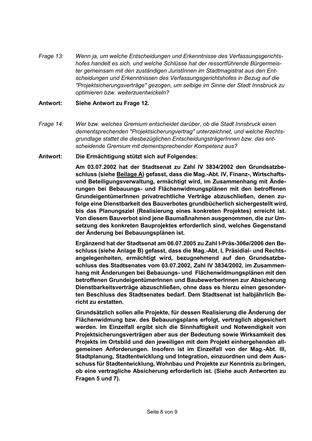 Ergänzend hat der Stadtsenat am 06.07.2005 zu Zahl I-Präs-306e/2006 den Beschluss (siehe Anlage B) gefasst, dass die Mag.-Abt. I, Präsidial- und Rechtsangelegenheiten, ermächtigt wird, bezugnehmend auf den Grundsatzbeschluss des Stadtsenates vom 03.07.2002, Zahl IV 3834/2002, im Zusammenhang mit Änderungen bei Bebauungs- und Flächenwidmungsplänen mit den