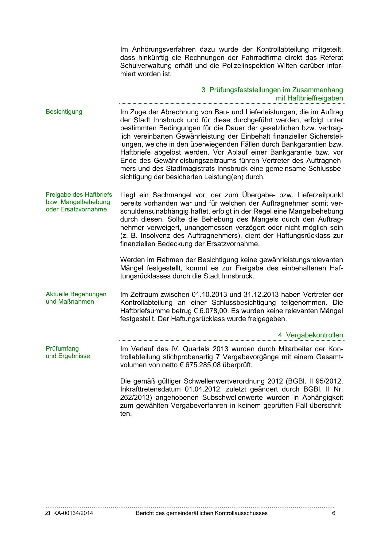 Im Verlauf des IV. Quartals 2013 wurden durch Mitarbeiter der Kontrollabteilung stichprobenartig 7 Vergabevorgänge mit einem Gesamtvolumen von netto € 675.285,08 überprüft.