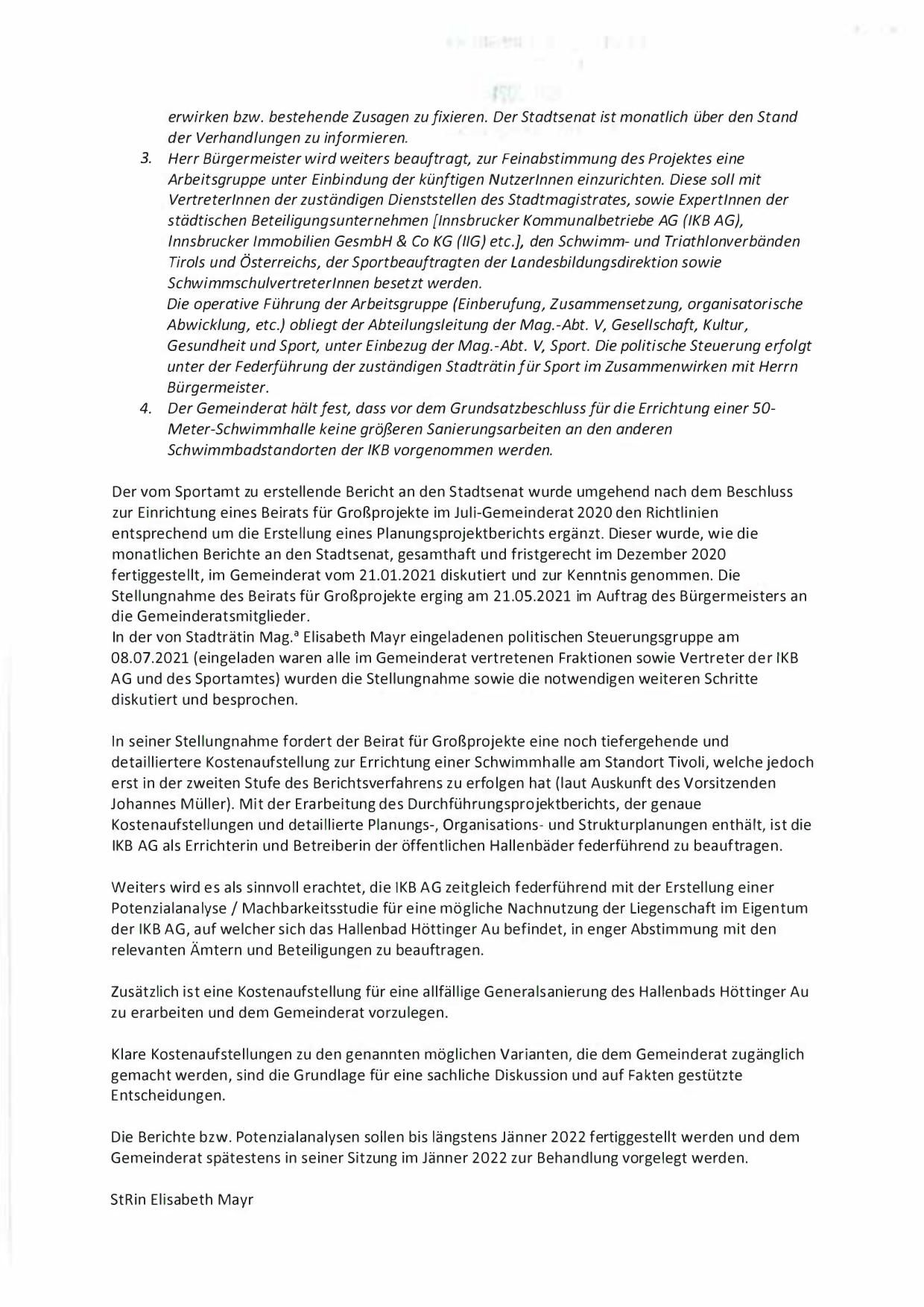4. Der Gemeinderat hält fest, dass vor dem Grundsatzbeschluss für die Errichtung einer 50Meter-Schwimmhalle keine größeren Sanierungsarbeiten an den anderen