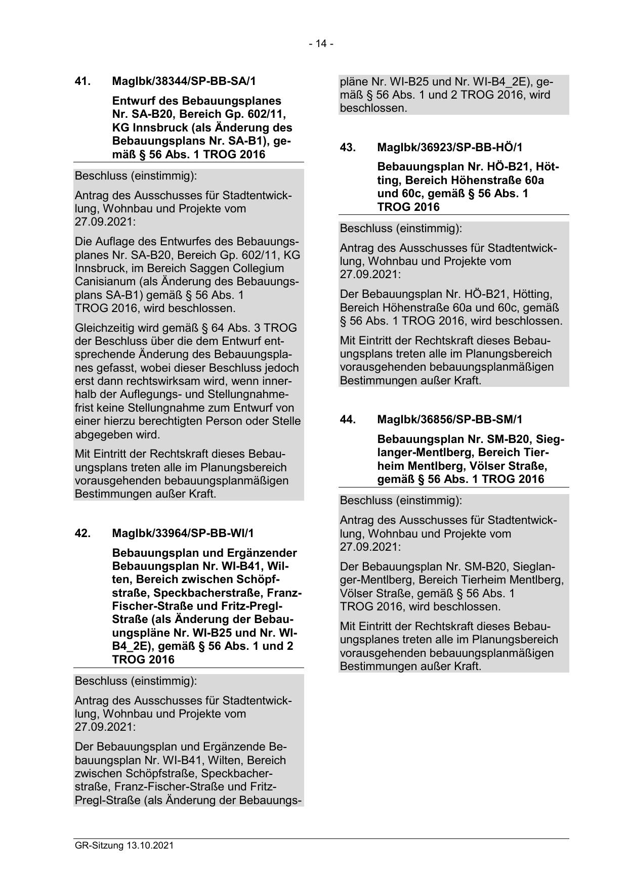 Bebauungsplan Nr. WI-B41, Wilten, Bereich zwischen Schöpfstraße, Speckbacherstraße, FranzFischer-Straße und Fritz-PreglStraße (als Änderung der Bebauungspläne Nr. WI-B25 und Nr. WIB4_2E), gemäß § 56 Abs. 1 und 2