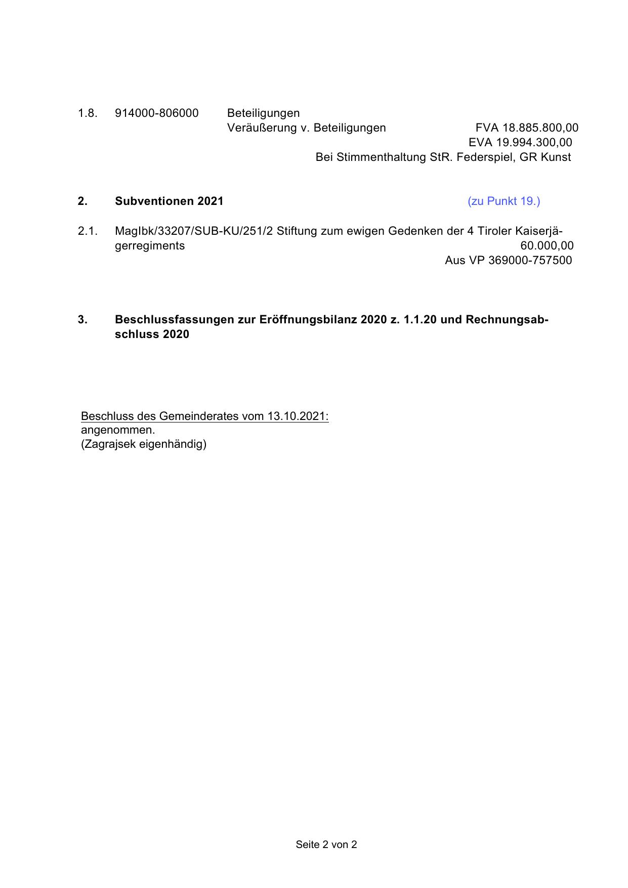 Beschlussfassungen zur Eröffnungsbilanz 2020 z. 1.1.20 und Rechnungsabschluss 2020