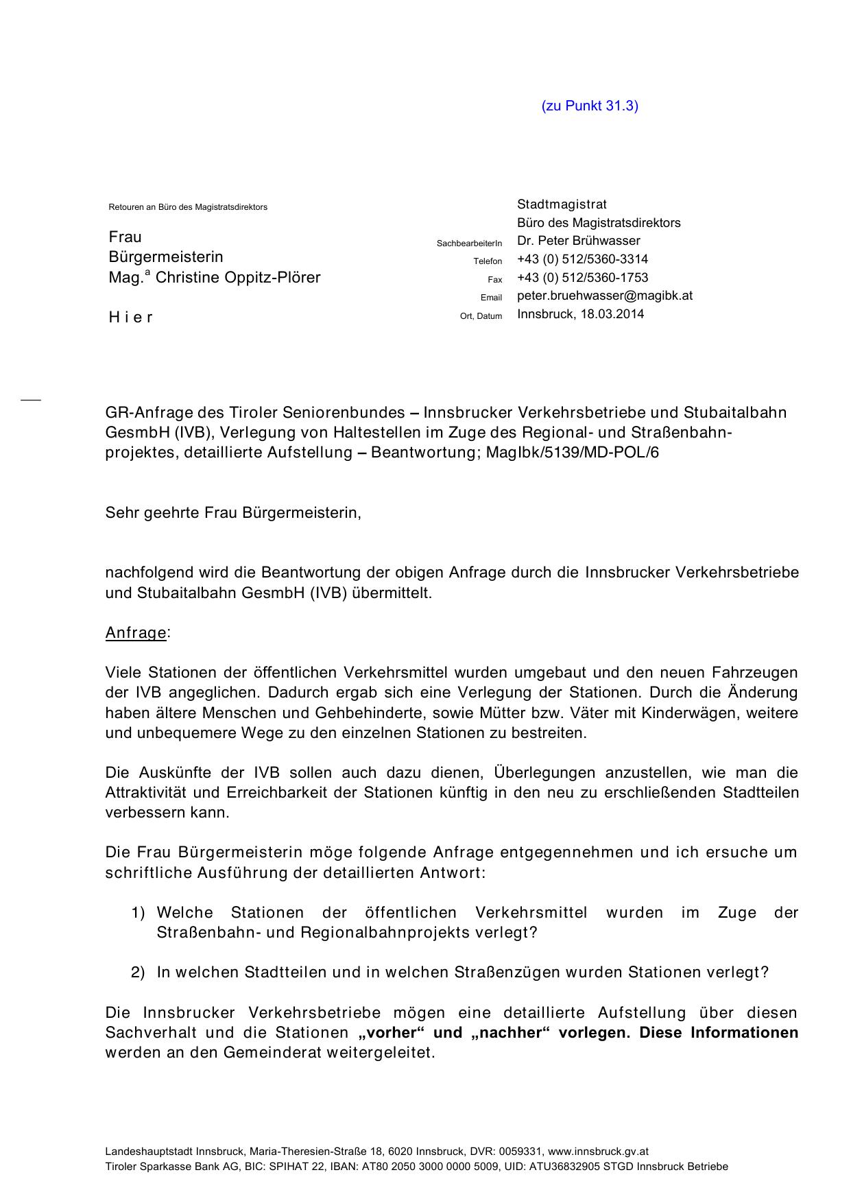 GesmbH (IVB), Verlegung von Haltestellen im Zuge des Regional- und Straßenbahnprojektes, detaillierte Aufstellung – Beantwortung; MagIbk/5139/MD-POL/6
