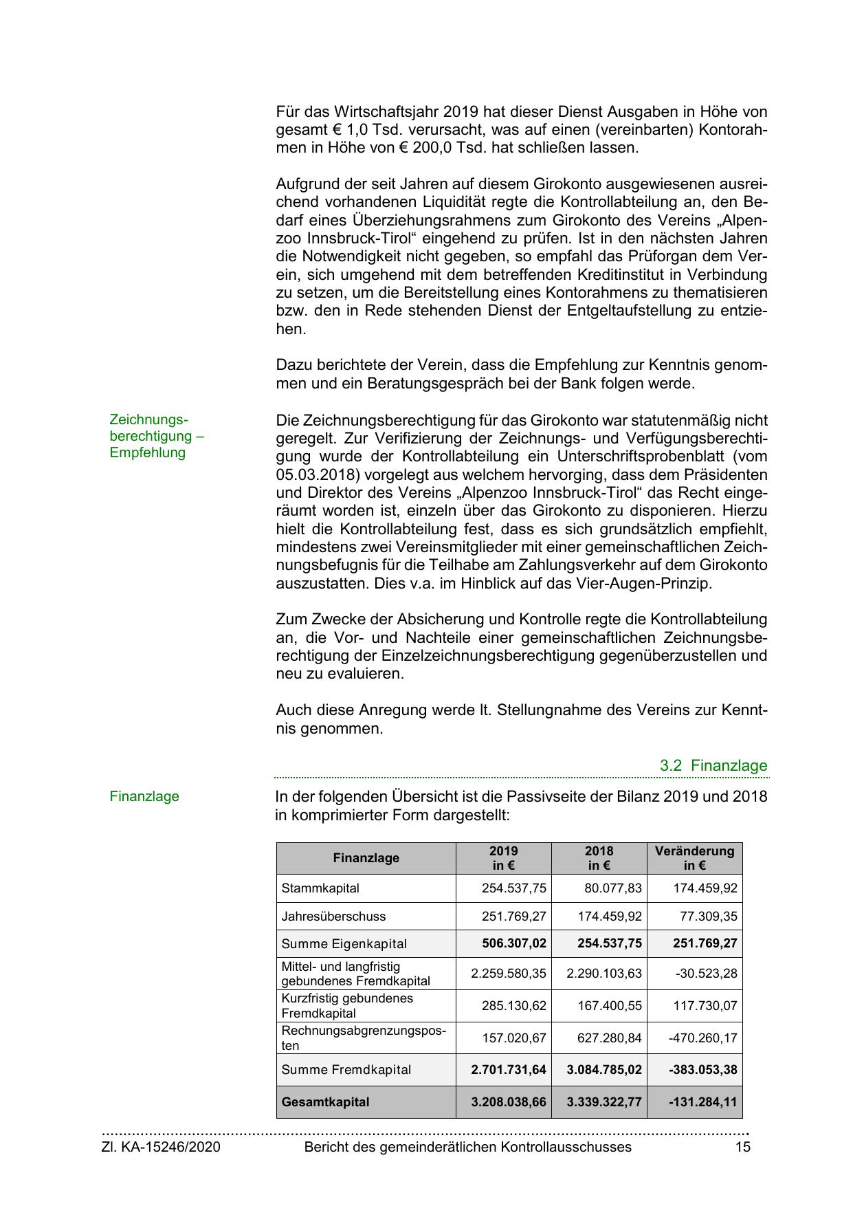 Aufgrund der seit Jahren auf diesem Girokonto ausgewiesenen ausreichend vorhandenen Liquidität regte die Kontrollabteilung an, den Bedarf eines Überziehungsrahmens zum Girokonto des Vereins „Alpenzoo Innsbruck-Tirol“ eingehend zu prüfen. Ist in den nächsten Jahren