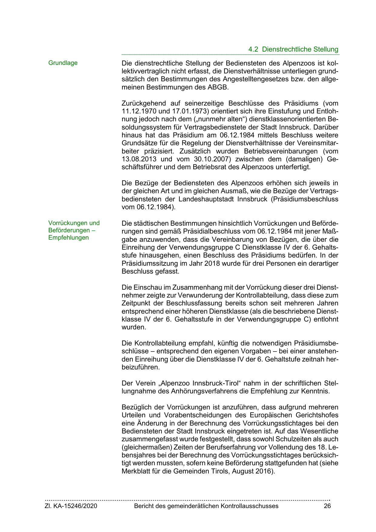 Die Kontrollabteilung empfahl, künftig die notwendigen Präsidiumsbeschlüsse – entsprechend den eigenen Vorgaben – bei einer anstehenden Einreihung über die Dienstklasse IV der 6. Gehaltstufe zeitnah herbeizuführen.