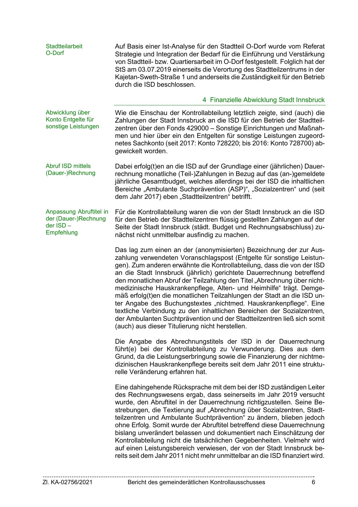 Zahlungen der Stadt Innsbruck an die ISD für den Betrieb der Stadtteilzentren über den Fonds 429000 – Sonstige Einrichtungen und Maßnahmen und hier über ein den Entgelten für sonstige Leistungen zugeordnetes Sachkonto (seit 2017: Konto 728220; bis 2016: Konto 728700) abgewickelt worden.