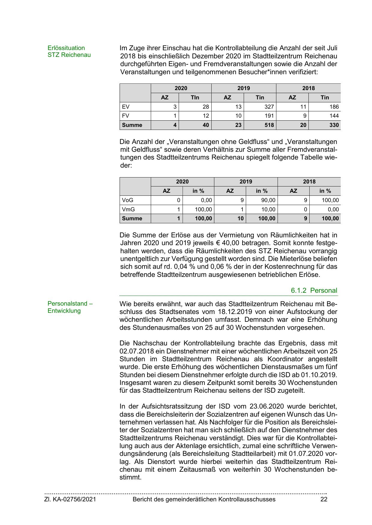 Stadtteilzentrums Reichenau verständigt. Dies war für die Kontrollabteilung auch aus der Aktenlage ersichtlich, zumal eine schriftliche Verwendungsänderung (als Bereichsleitung Stadtteilarbeit) mit 01.07.2020 vorlag. Als Dienstort wurde hierbei weiterhin das Stadtteilzentrum Reichenau mit einem Zeitausmaß von weiterhin 30 Wochenstunden bestimmt.