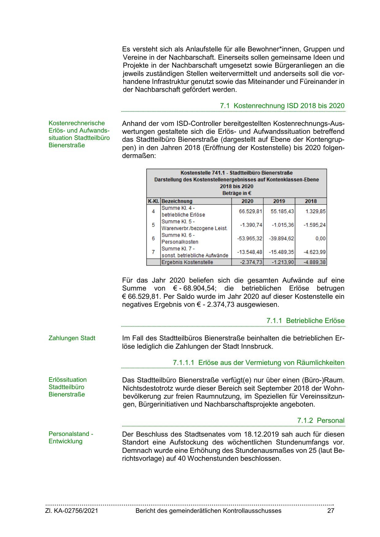 Im Fall des Stadtteilbüros Bienerstraße beinhalten die betrieblichen Erlöse lediglich die Zahlungen der Stadt Innsbruck.