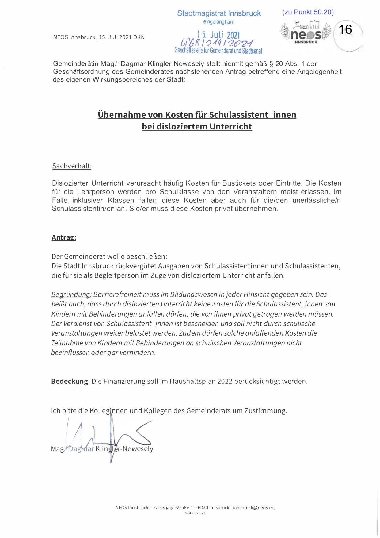 Gemei nderäti n M a g .a Dag m a r K l i n g l e r-N ewesely ste l lt h i e rm it g e m ä ß § 20 Abs . 1 der
