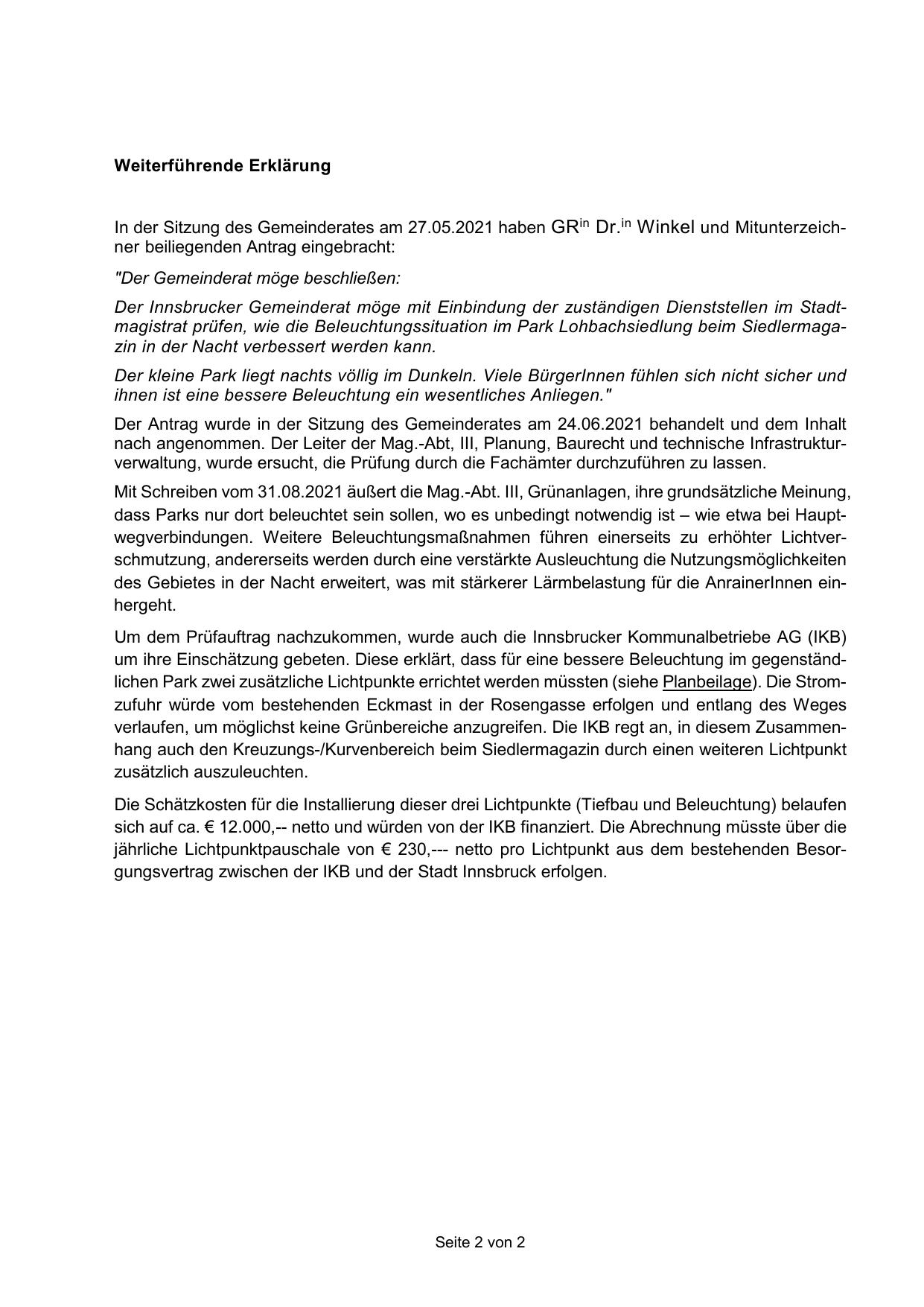 Der Innsbrucker Gemeinderat möge mit Einbindung der zuständigen Dienststellen im Stadtmagistrat prüfen, wie die Beleuchtungssituation im Park Lohbachsiedlung beim Siedlermagazin in der Nacht verbessert werden kann.