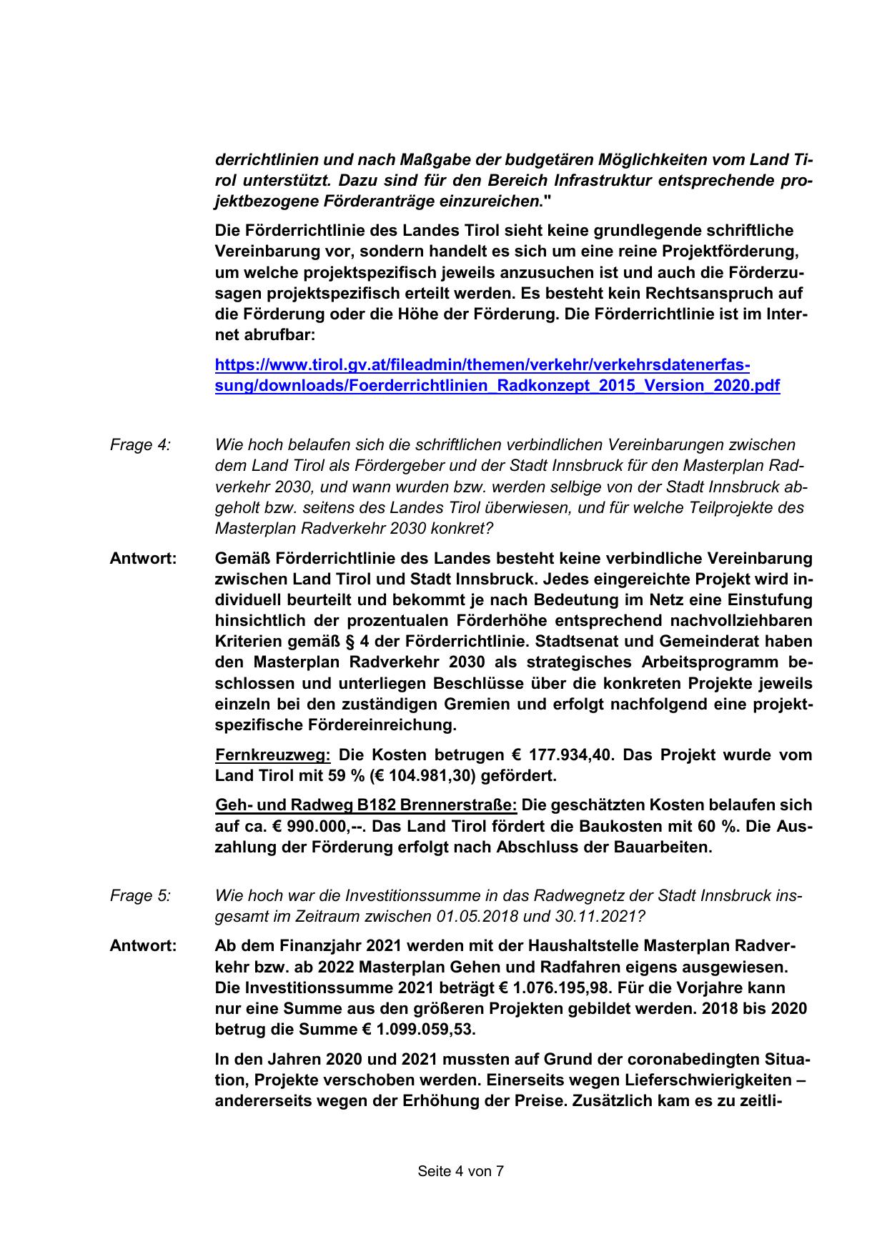 dem Land Tirol als Fördergeber und der Stadt Innsbruck für den Masterplan Radverkehr 2030, und wann wurden bzw. werden selbige von der Stadt Innsbruck abgeholt bzw. seitens des Landes Tirol überwiesen, und für welche Teilprojekte des