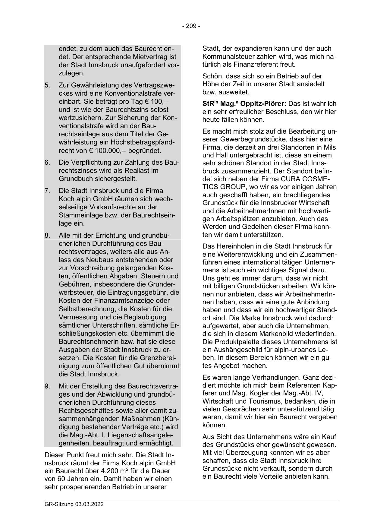Dieser Punkt freut mich sehr. Die Stadt Innsbruck räumt der Firma Koch alpin GmbH