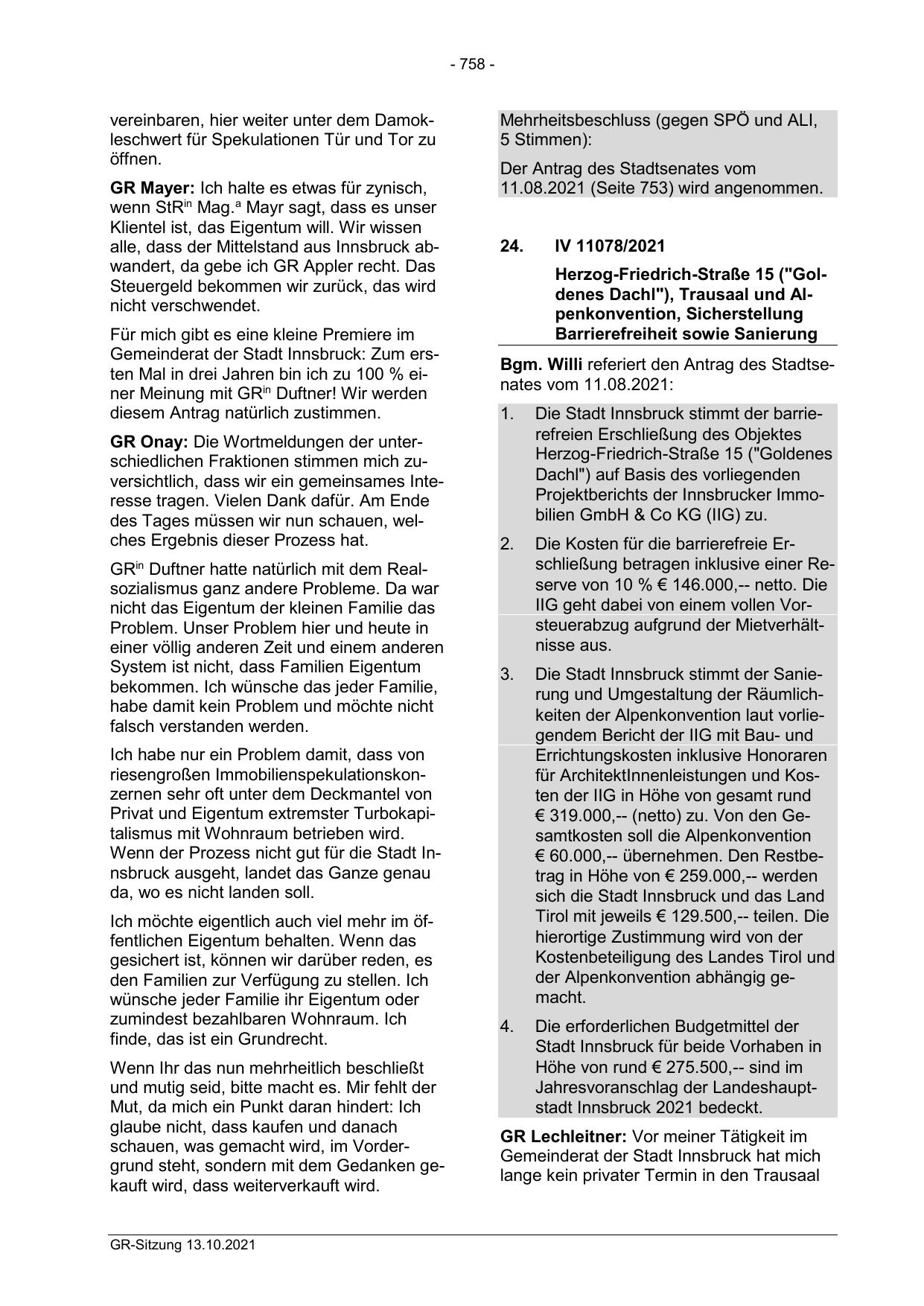 Mehrheitsbeschluss (gegen SPÖ und ALI,