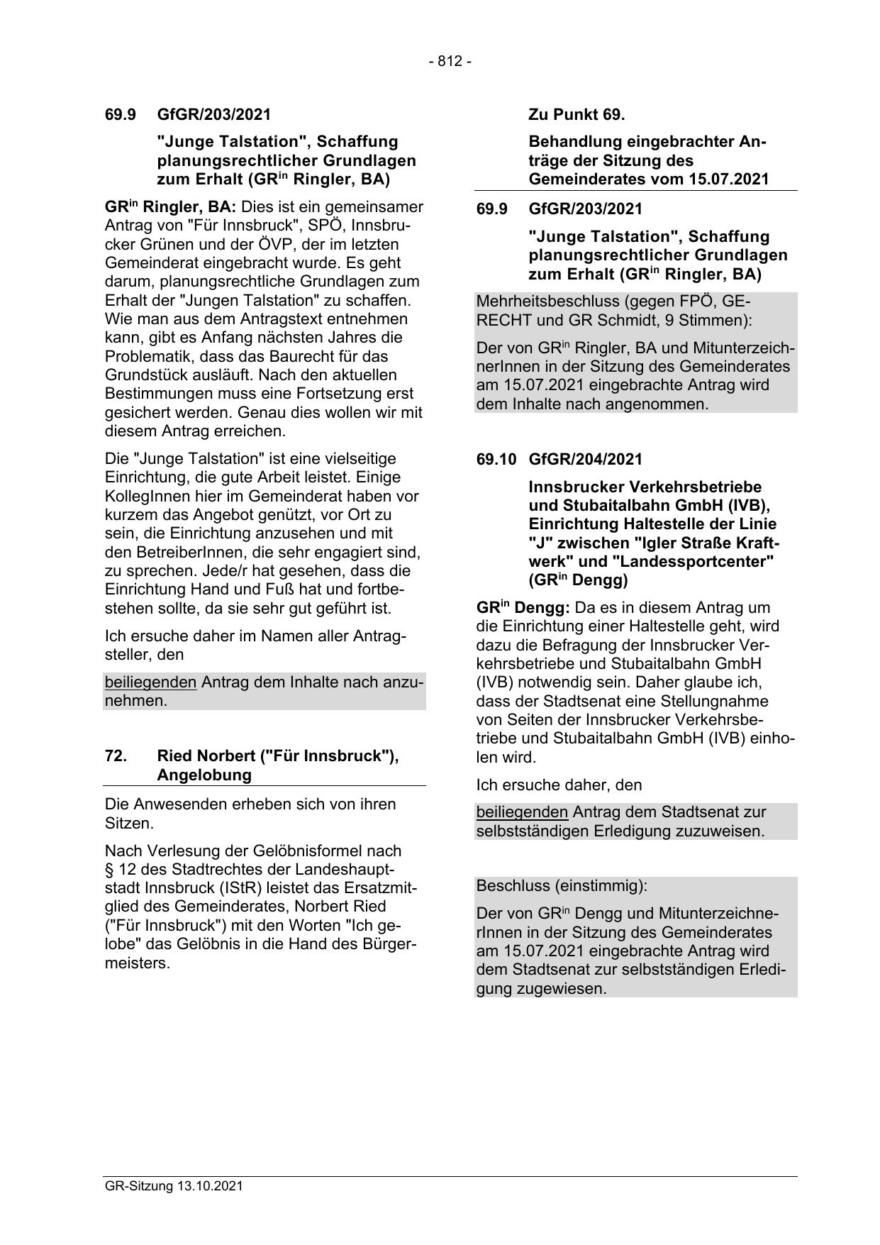 § 12 des Stadtrechtes der Landeshauptstadt Innsbruck (IStR) leistet das Ersatzmitglied des Gemeinderates, Norbert Ried
