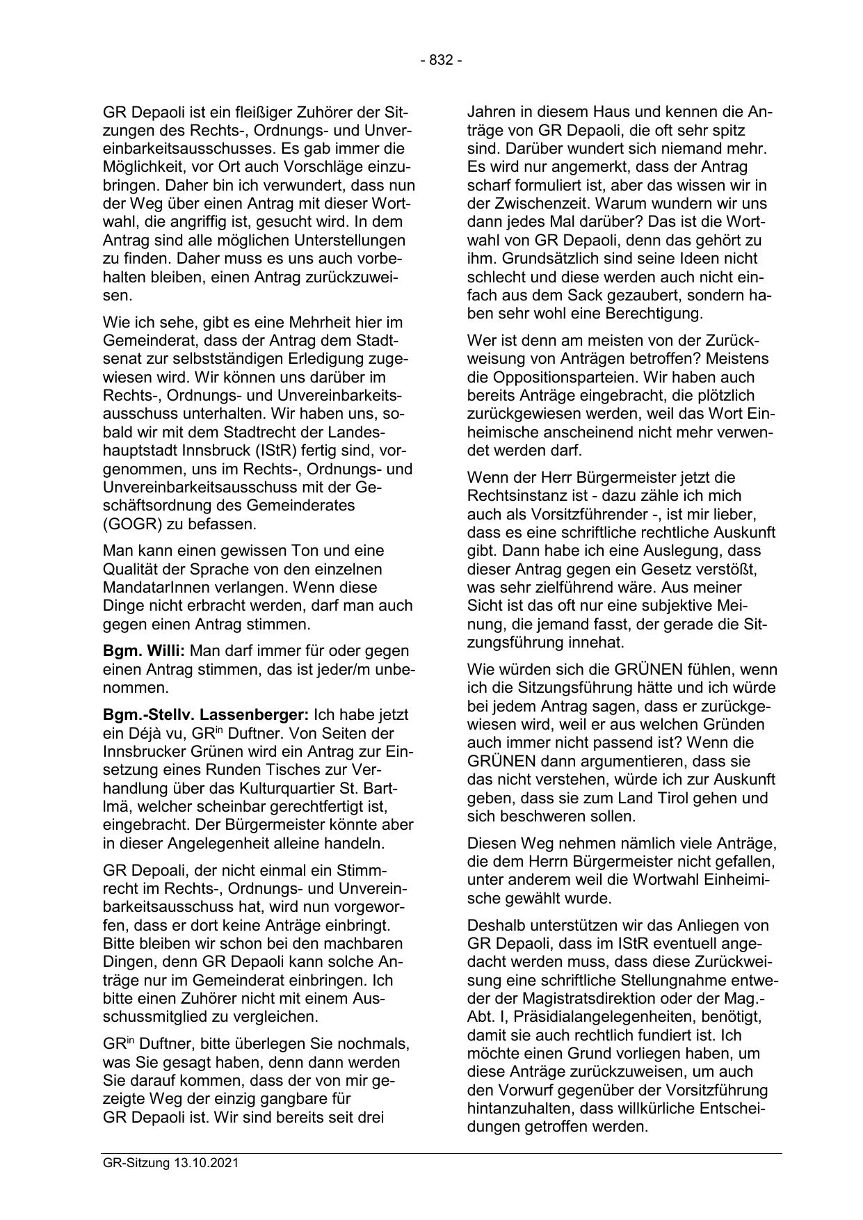 Rechts-, Ordnungs- und Unvereinbarkeitsausschuss unterhalten. Wir haben uns, sobald wir mit dem Stadtrecht der Landeshauptstadt Innsbruck (IStR) fertig sind, vorgenommen, uns im Rechts-, Ordnungs- und
