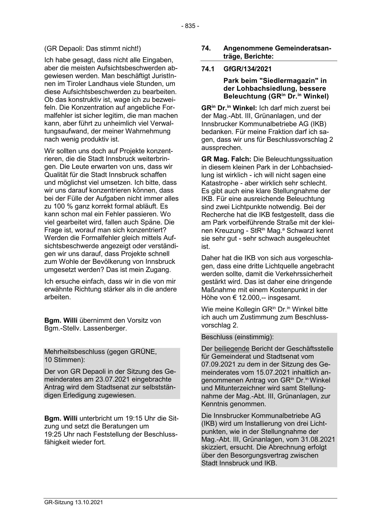 Der von GR Depaoli in der Sitzung des Gemeinderates am 23.07.2021 eingebrachte