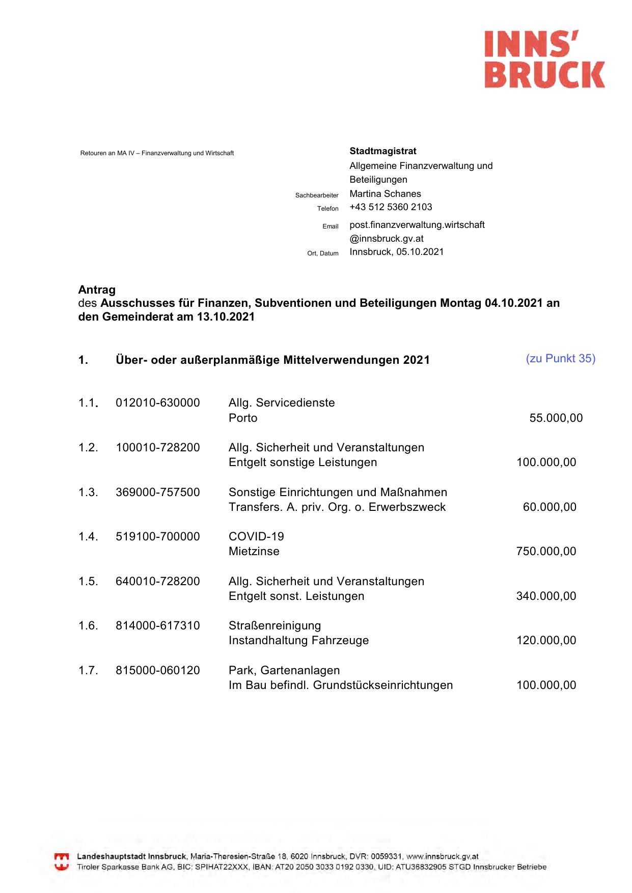 Tiroler Sparkasse Bank AG, BIC: SP IHAT22XXX, IBAN: AT20 2050 3033 0192 0330, UIO: ATU36832905 STGD lnnsbrucker Betriebe