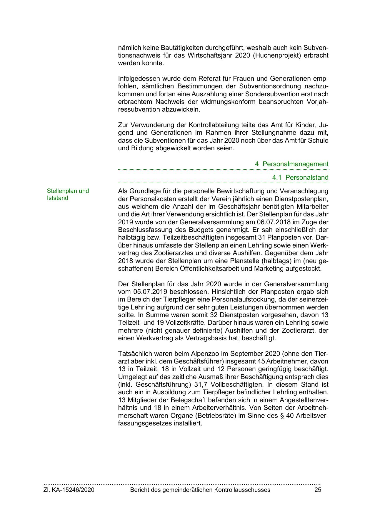 halbtägig bzw. Teilzeitbeschäftigten insgesamt 31 Planposten vor. Darüber hinaus umfasste der Stellenplan einen Lehrling sowie einen Werkvertrag des Zootierarztes und diverse Aushilfen. Gegenüber dem Jahr
