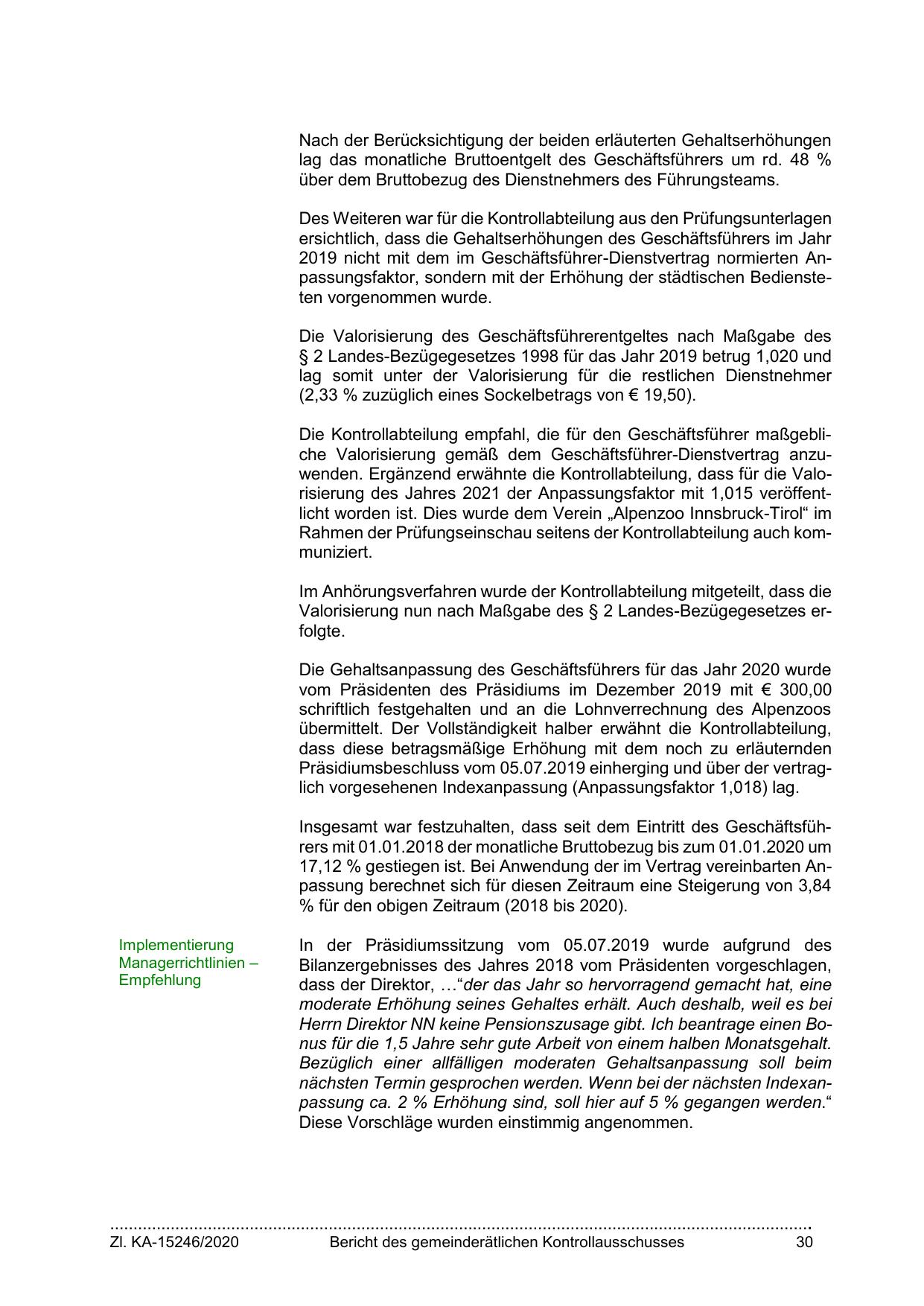 Die Kontrollabteilung empfahl, die für den Geschäftsführer maßgebliche Valorisierung gemäß dem Geschäftsführer-Dienstvertrag anzuwenden. Ergänzend erwähnte die Kontrollabteilung, dass für die Valorisierung des Jahres 2021 der Anpassungsfaktor mit 1,015 veröffentlicht worden ist. Dies wurde dem Verein „Alpenzoo Innsbruck-Tirol“ im