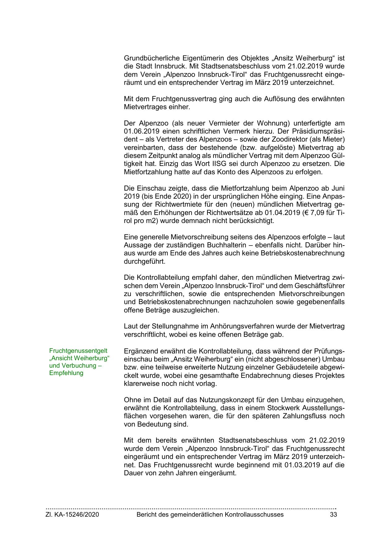 Ergänzend erwähnt die Kontrollabteilung, dass während der Prüfungseinschau beim „Ansitz Weiherburg“ ein (nicht abgeschlossener) Umbau