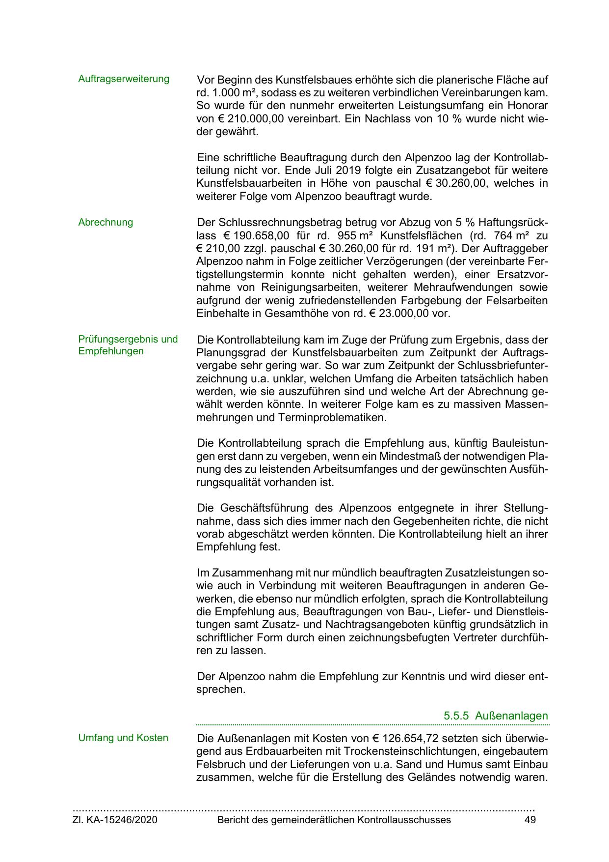 Die Kontrollabteilung sprach die Empfehlung aus, künftig Bauleistungen erst dann zu vergeben, wenn ein Mindestmaß der notwendigen Planung des zu leistenden Arbeitsumfanges und der gewünschten Ausführungsqualität vorhanden ist.