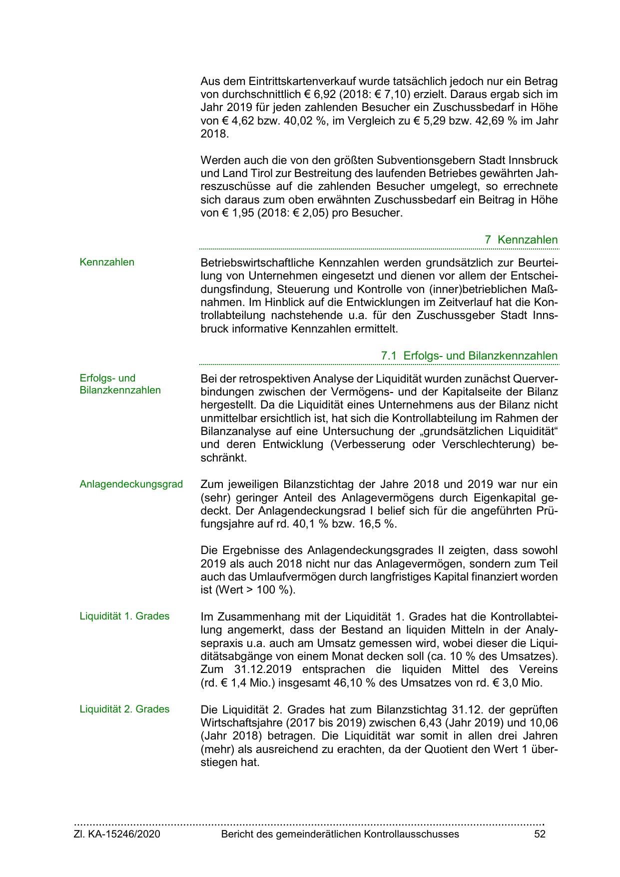 Betriebswirtschaftliche Kennzahlen werden grundsätzlich zur Beurteilung von Unternehmen eingesetzt und dienen vor allem der Entscheidungsfindung, Steuerung und Kontrolle von (inner)betrieblichen Maßnahmen. Im Hinblick auf die Entwicklungen im Zeitverlauf hat die Kontrollabteilung nachstehende u.a. für den Zuschussgeber Stadt Innsbruck informative Kennzahlen ermittelt.