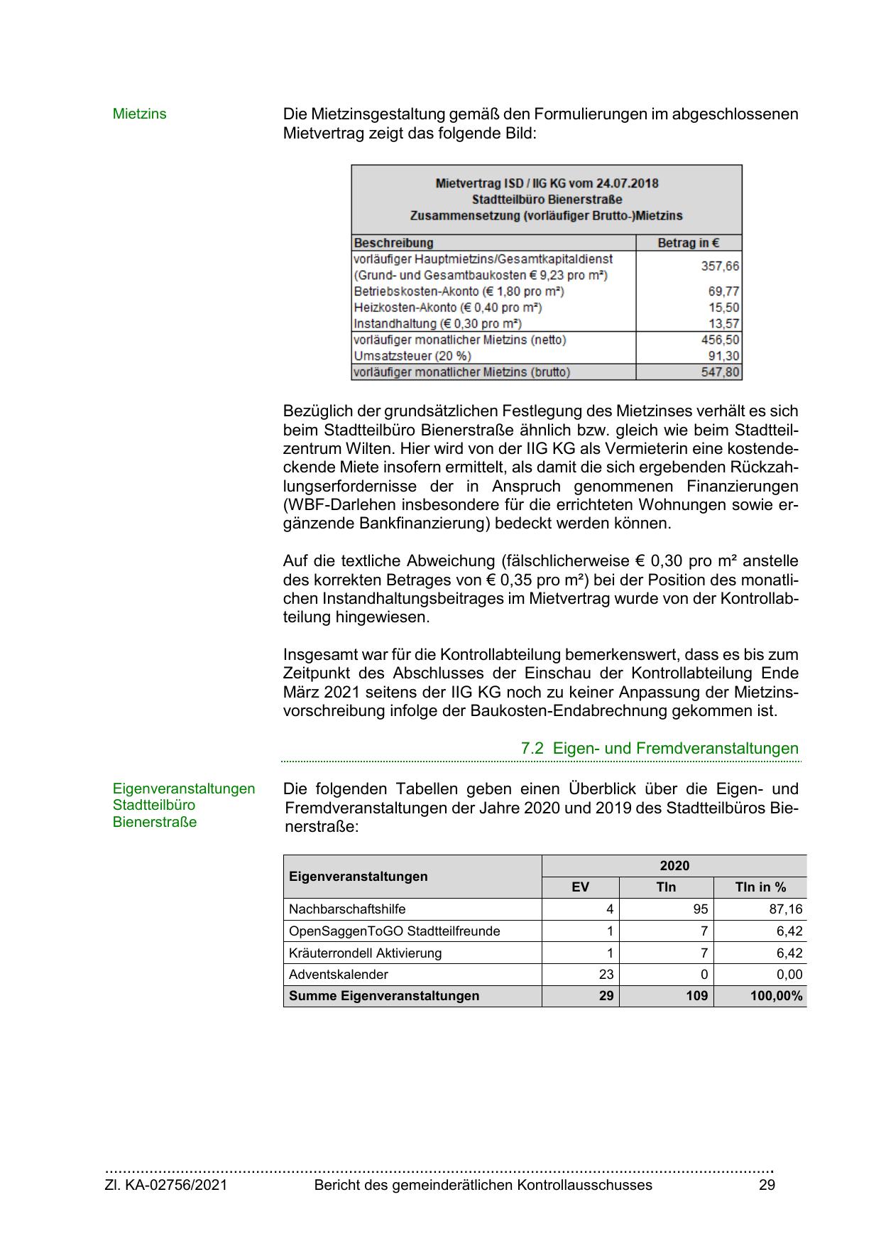 beim Stadtteilbüro Bienerstraße ähnlich bzw. gleich wie beim Stadtteilzentrum Wilten. Hier wird von der IIG KG als Vermieterin eine kostendeckende Miete insofern ermittelt, als damit die sich ergebenden Rückzahlungserfordernisse der in Anspruch genommenen Finanzierungen