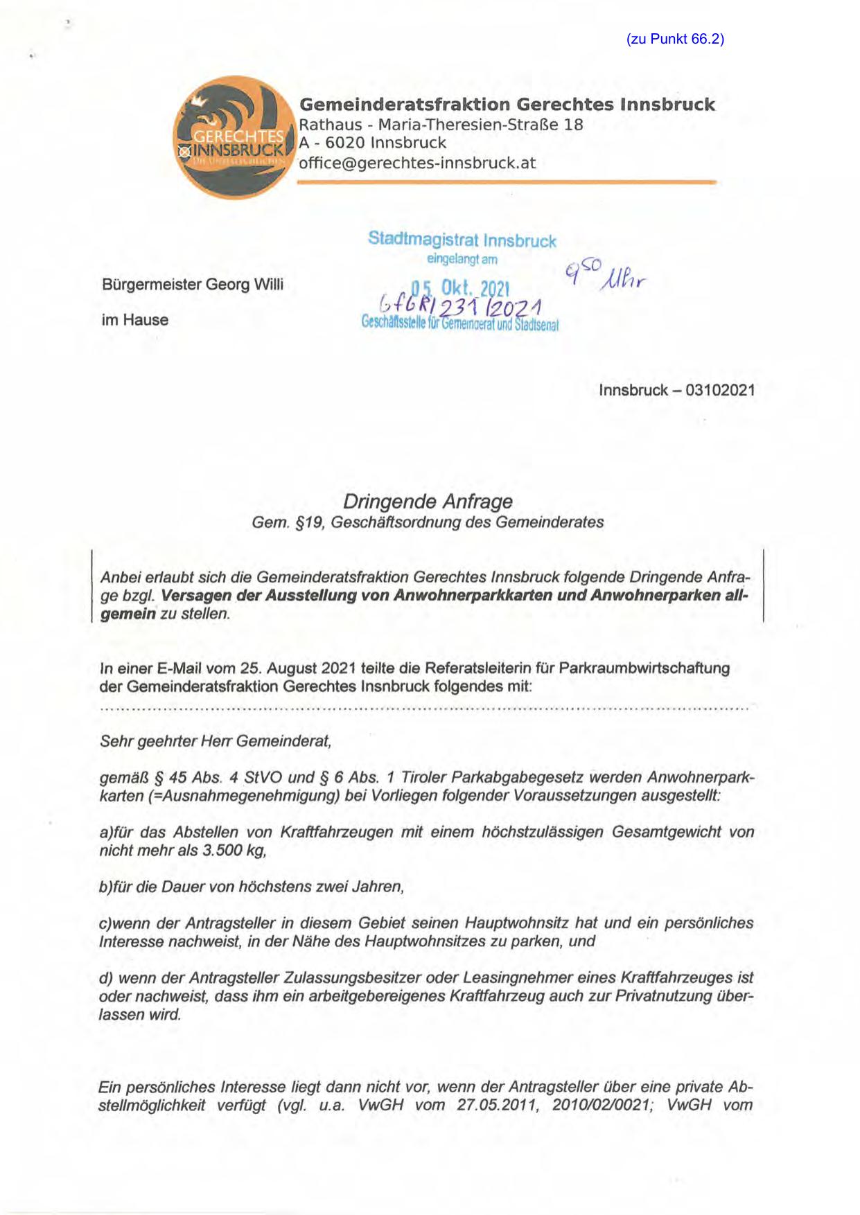 Anbei erlaubt sich die Gemeinderatsfraktion Gerechtes Innsbruck folgende Dringende Anfrage bzgl. Versagen _d er Ausstellung von Anwohnerparkkarten und Anwohnerparken all~