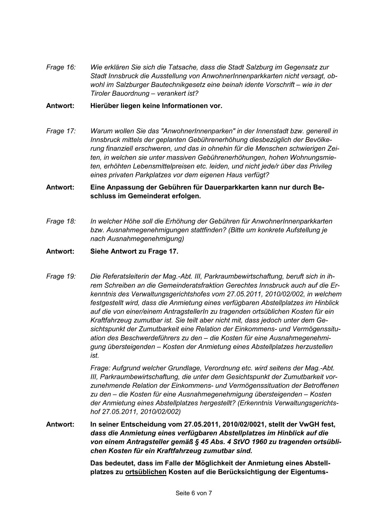 Die Referatsleiterin der Mag.-Abt. III, Parkraumbewirtschaftung, beruft sich in ihrem Schreiben an die Gemeinderatsfraktion Gerechtes Innsbruck auch auf die Erkenntnis des Verwaltungsgerichtshofes vom 27.05.2011, 2010/02/002, in welchem